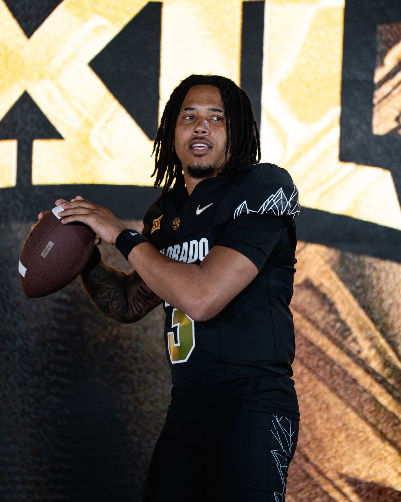 Colorado quarterback Kaidon Salter participates in a photo shoot during Big 12 football media day on July 9. (CU Athletics/courtesy photo)