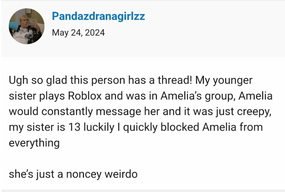 “My younger sister plays Roblox and was in Amelia’s group,” another user wrote. “Amelia would constantly message her and it was just creepy, my sister is 13 luckily I quickly blocked Amelia from everything.”