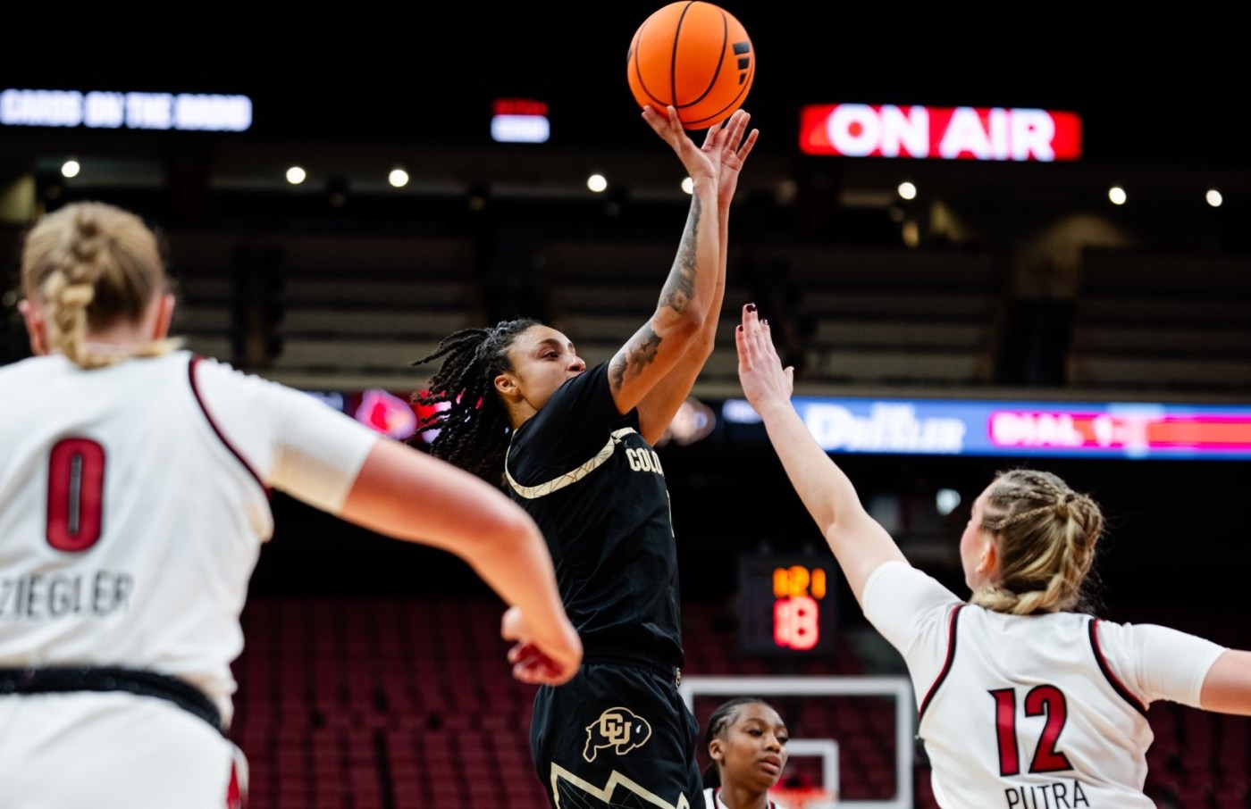 Over the next 6:17, however, Louisville went on a 14-2 run to take its first lead, 24-23. The Buffs then responded with a 10-1 run to bump their lead to 33-25. Louisville hit a 3-pointer just before the halftime buzzer, but CU went into intermission with a 37-34 lead.