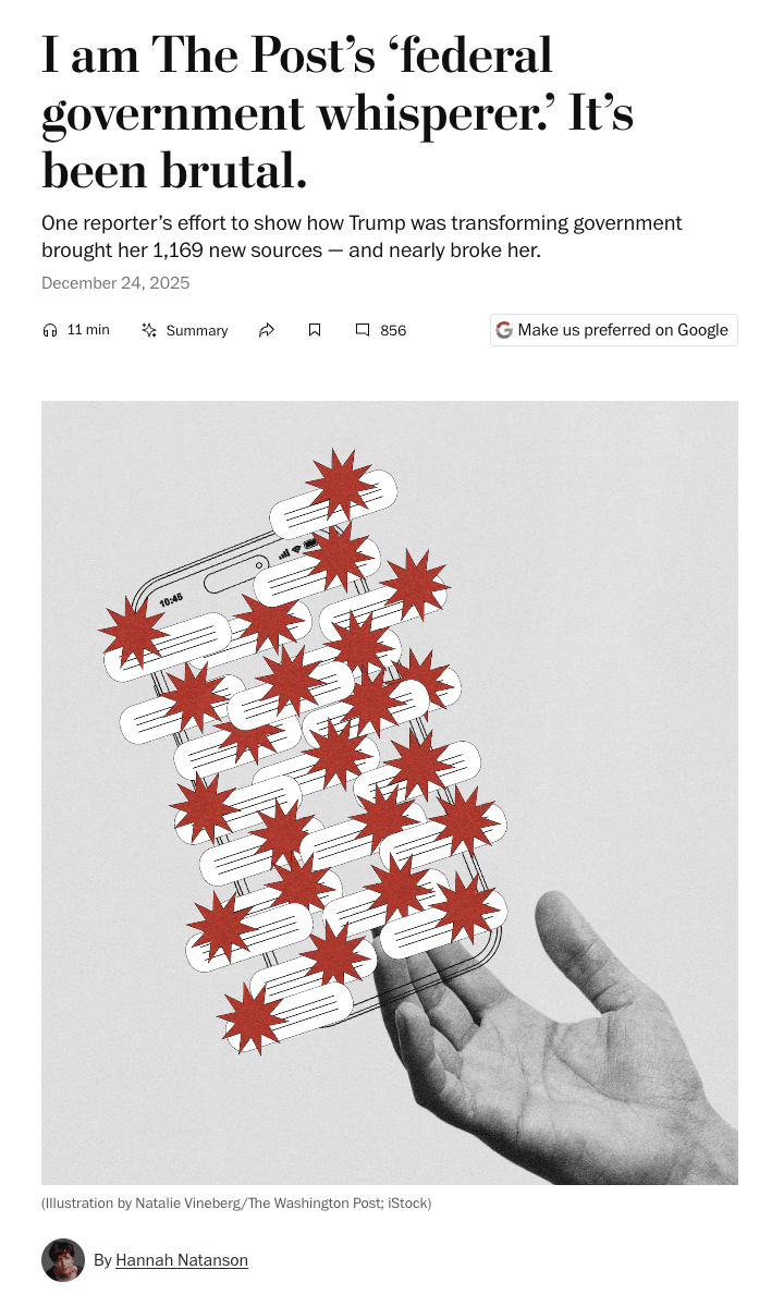I shuddered when I read this article from Hannah Natanson in real time, in December, which was the first I really took notice of the name behind a flood of important reporting on Trump’s attack on the government.