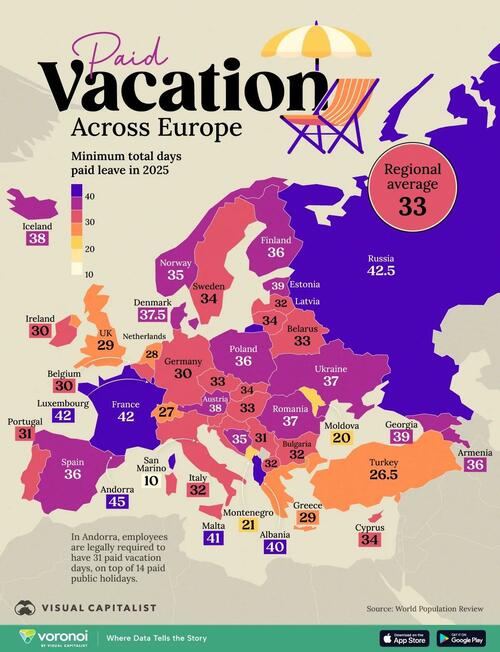This map, via Visual Capitalist’s Niccolo Conte, shows the minimum total number of paid leave days in Europe in 2025.