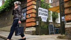 Getty Images A woman holding a black bag walks away from a set of open metal gates, which has a white sign with 'polling station' written in black text on it.Getty Images
