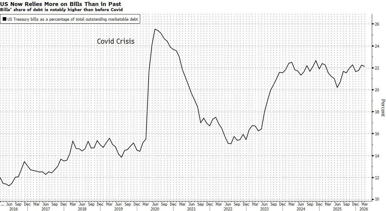 Besides funding runaway US debt, another danger flagged by the IMF was the increasing reliance of the US Treasury on sales of short-dated debt, a process launched by Janet Yellen and her Activist Treasury Issuance, and maintained ever since. Having initially criticized the Bill buildout, Treasury Secretary Scott Bessent last year said that it didn’t make sense to expand issuance of longer-dated securities, given that their yield levels were above those of T-Bills, which mature in under a year.