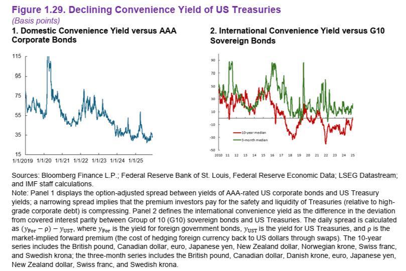 As Bloomberg reports, the IMF pointed to a narrowing gap between the yields of AAA rated corporate bonds and Treasuries as a sign of reduced appeal for US government securities. While spreads have typically been viewed as a gauge of the risk investors estimate for corporate borrowers, the fund is flipping that analysis on its head to view it as a metric of how much extra buyers are willing to pay for Treasuries.
