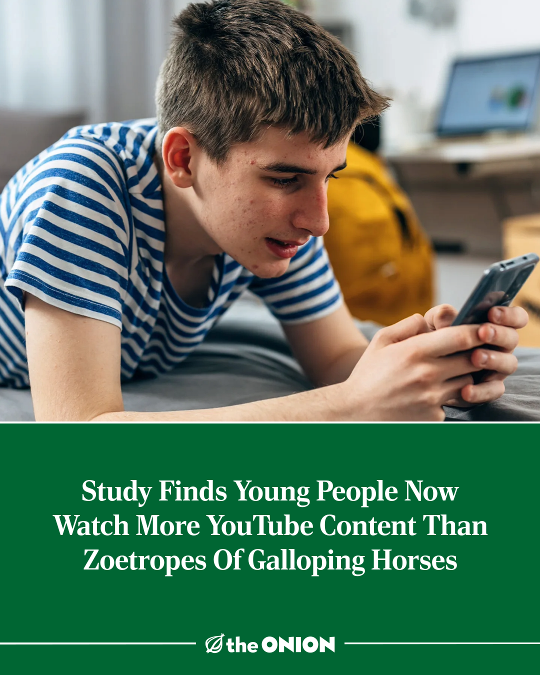 In a groundbreaking finding that reveals a major shift in media consumption habits, a new study published Wednesday found that young people now watch more YouTube content than zoetropes of galloping horses. “It may be hard for older generations to understand, but today’s young consumers are much more interested in watching videos on their phones than peering into a spinning cylinder,” said study co-author Jeremy Hernandez, who shared that his marketing firm had found that the average member of Generation Z spent less than two hours a week sitting in front of one of the motion illusion machines.