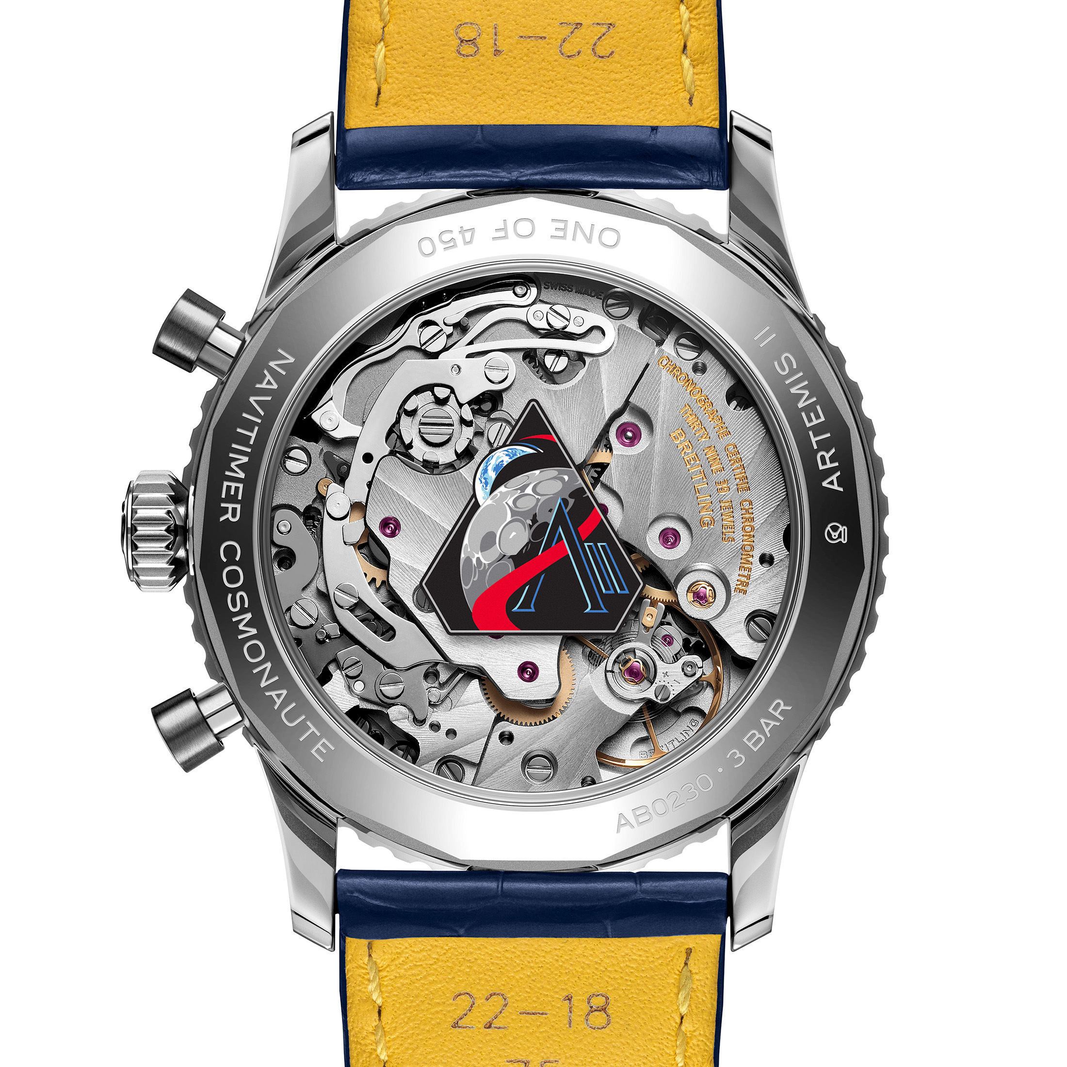 Save for the dial color, steel case, and black slide rule, the special Artemis II limited edition generally keeps to the Cosmonaute Navitimer playbook. The link to theArtemis II mission is noted only on the caseback with the mission logo placed in the middle of the sapphire display window. ‘Artemis II’ and ‘One of 450’ are also engraved on the steel ring surrounding the sapphire window.