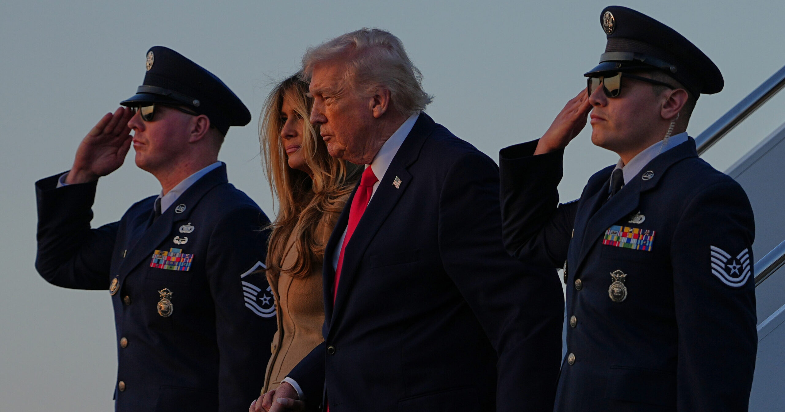 President Donald Trump and First Lady Melania Trump arrive on Air Force One at Palm Beach International Airport in West Palm Beach, Florida, on Feb. 13, 2026. (AP Photo / Matt Rourke)