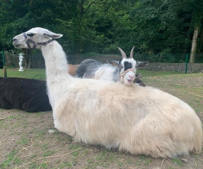 A llama named Noah and two pygmy goats named Tuppence and Penny escaped from a farm in Dumbarton, Scotland, and ended up blocking traffic on the A82 highway. Photo courtesy of Overtoun Llama Lodges/Facebook