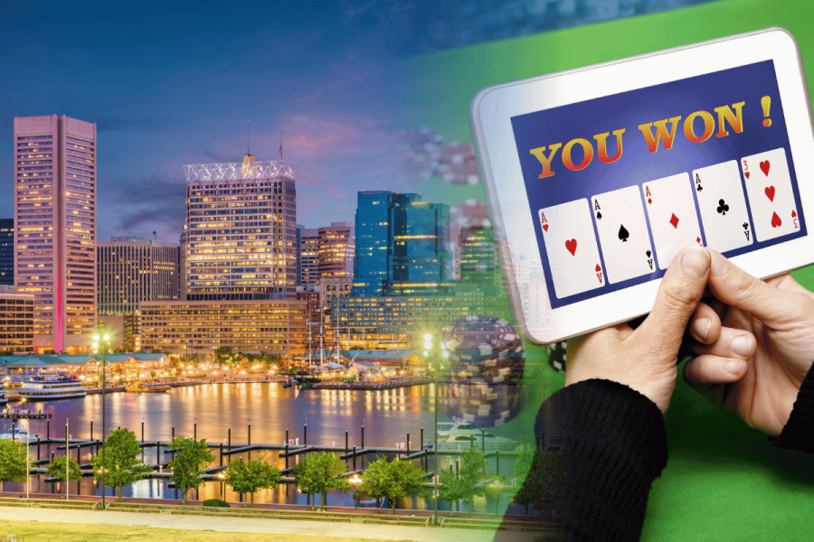Maryland sweepstakes gaming legislation image showing Baltimore skyline and tablet casino win screen after 2026 bills stalled