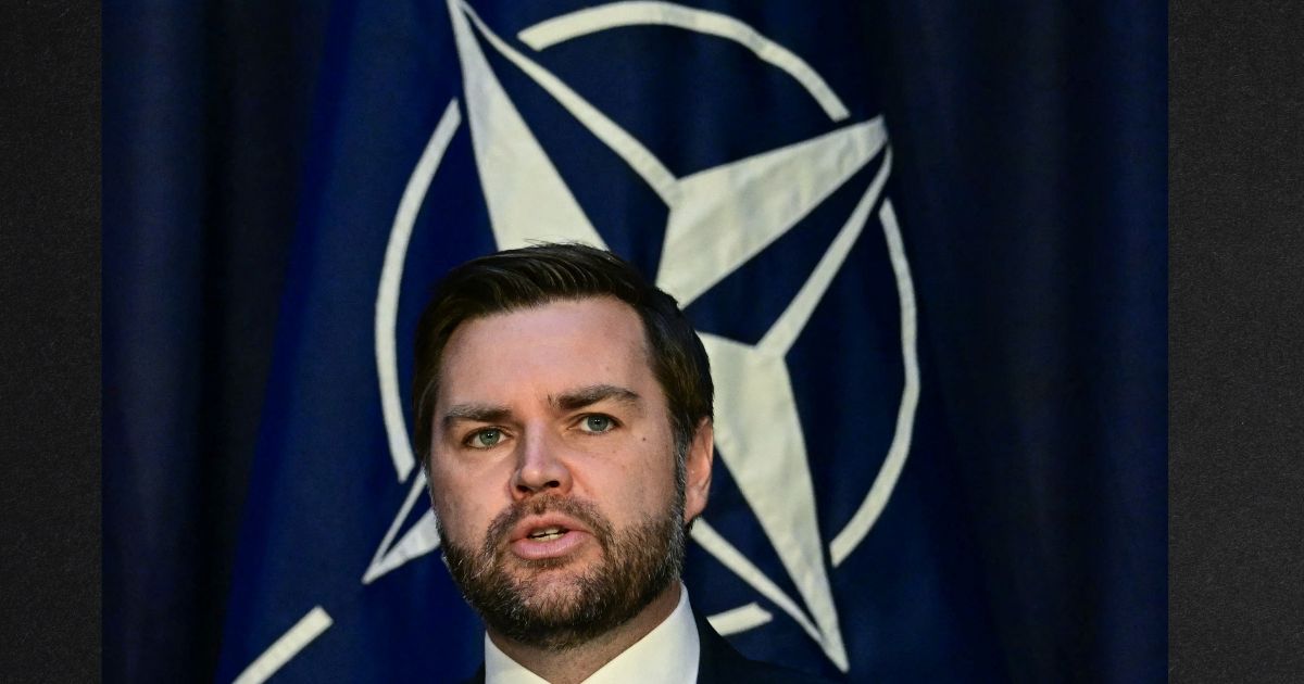 Vice President J.D. Vance speaks in front of the NATO logo in February 2025 at the 61st Munich Security Conference in Munich, Germany. (Tobias Schwarz – AFP / Getty Images)
