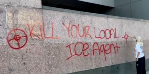 A left-wing agitator vandalized a federal building in Los Angeles on Saturday, spray-painting the words “kill your local ICE agent” during the “No Kings” protest.