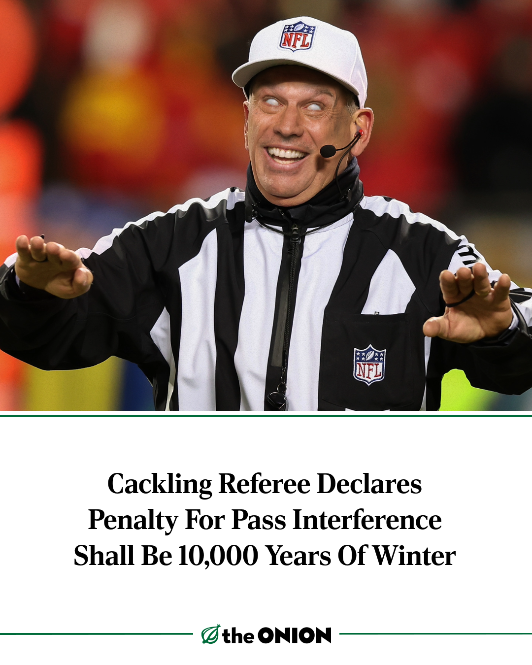 Raising his hands before him as his eyes turned ominously white, the referee of the Steelers–Dolphins game was heard to let out a blood-curdling cackle Monday before declaring the penalty for defensive pass interference would be “no fewer than 10,000 years of winter.” “Hear me, mortals, and know that for the grave transgression of hindering the receiver in violation of the laws of football, the defender who wears number five has incurred a terrible judgment that shall afflict the earth for many ages!” the official said in response to an infraction by Steelers cornerback Jalen Ramsey, his thunderous voice causing fans to clutch their ears in agony, birds to fall dead from the sky, and frost to begin forming on all visible surfaces.