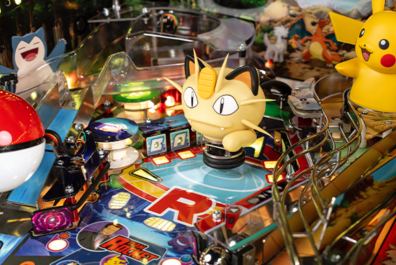 Prepare for a Pokémon challenge unlike any you’ve faced before with the new Pokémon pinball game by Stern Pinball. This isn’t a digital recreation of pinball (as great as those may be), but an authentic, full-size pinball machine created by one of the true pioneers of the game. The action unfolds across a colorful playfield decorated with Pokémon imagery and loaded with all the ramps, bumpers, and targets you’d expect to find in a pinball game. The board also features a large Poké Ball, an animatronic Pikachu, and Team Rocket’s iconic hot air balloon—the one that looks like Meowth—along with a screen above the table to show off animations as you play.