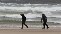 Getty Images Two people bend into the wind as they walk along a beach with crashing waves behind themGetty Images
