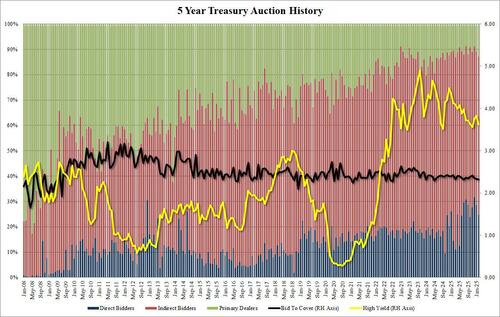 The bid to cover was ugly, dropping to 2.32, down from 2.34 and the lowest since July 2025.