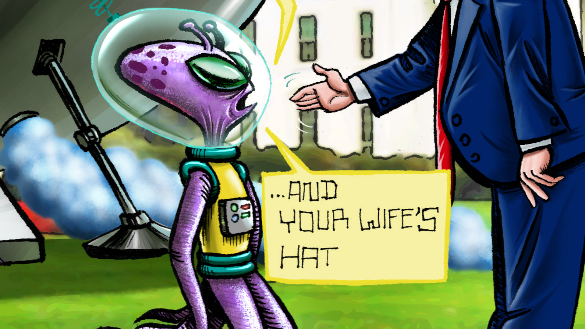 If actual aliens landed in the White House lawn, Boy wouldn’t that be like a god-sent gift to Donnie, even if it unleashed global panic like ALL the Hollywood movies have predicted?!
