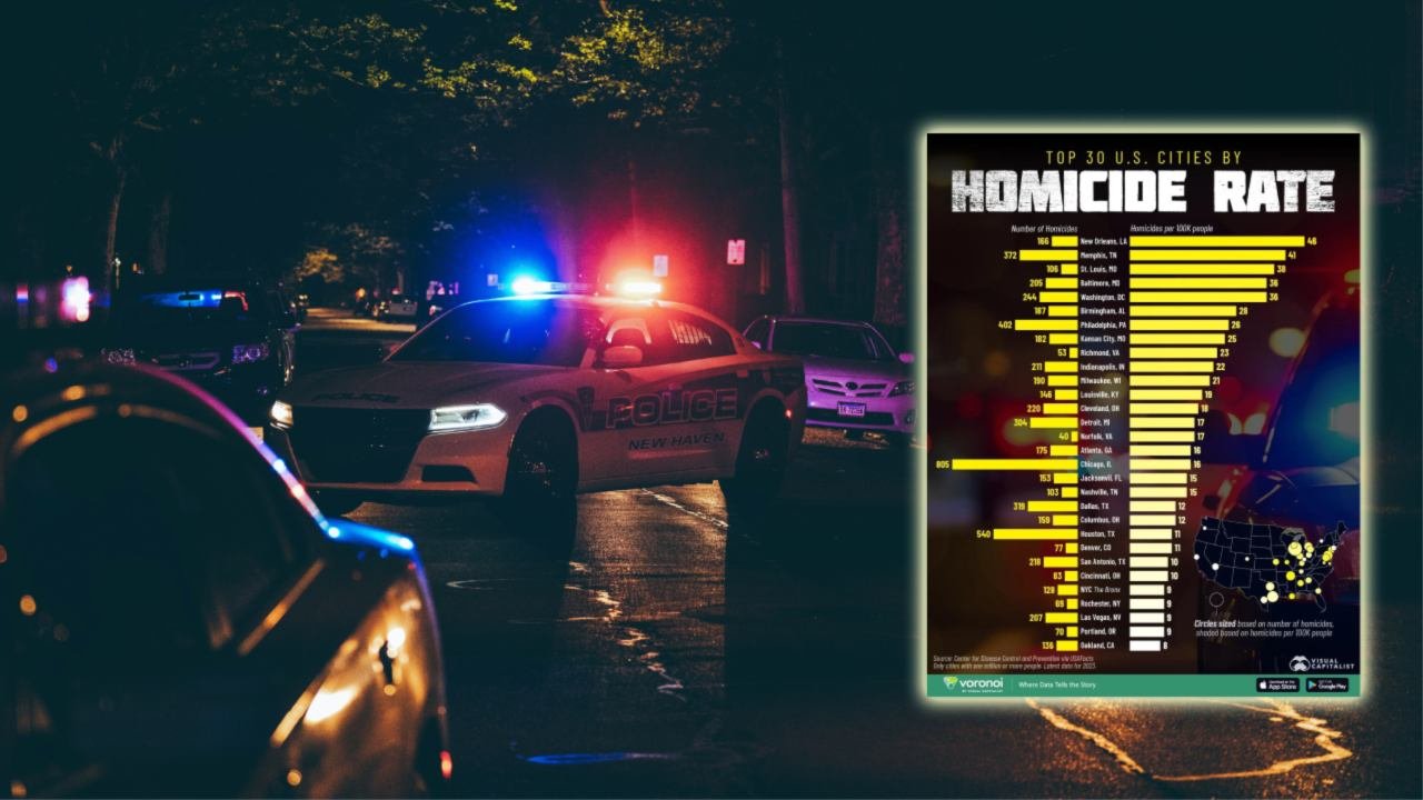 New Orleans tops the list with 46 homicides per 100,000 people, followed closely by Memphis at 41. Both cities consistently rank near the top due to long-term structural challenges, including poverty, strained social services, and persistent violent crime.