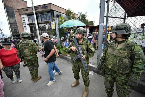 Military personnel patrol a market as they carry out weapons and drug checks in Quito, Ecuador, on Feb. 10, 2026. Rodrigo Buendia/AFP via Getty Images
