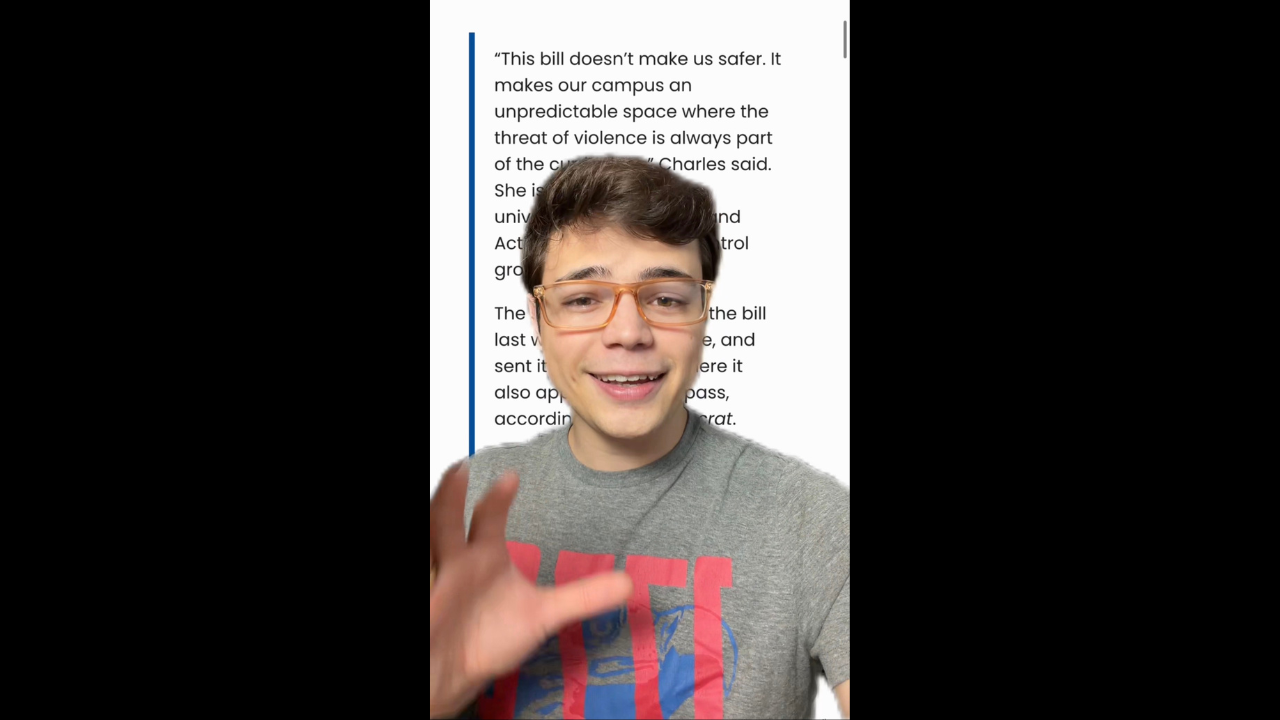 Student speaking about campus safety concerns related to new legislation, with text displayed in the background discussing the impact of the bill.
