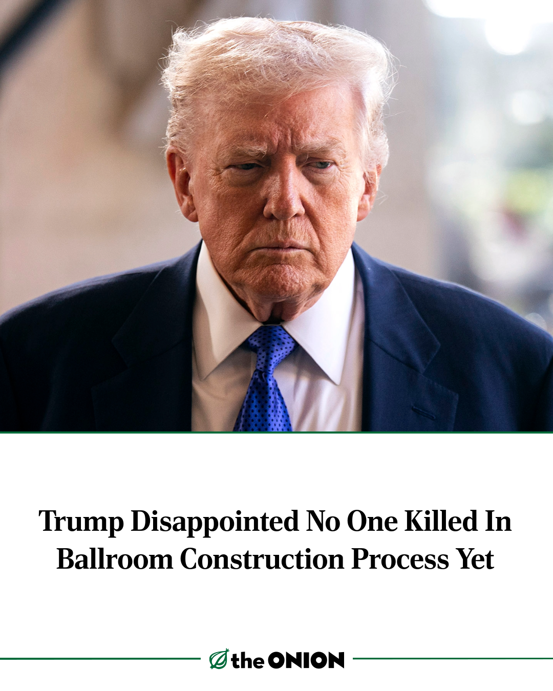 Voicing deep frustration with the lack of jobsite carnage, President Donald Trump expressed disappointment Thursday that no one had been killed yet in the construction of the White House ballroom. “It’s been months since we started, and I still haven’t seen one worker get impaled by rebar or have his head smashed in by falling rubble,” said Trump, adding that he had at least hoped to witness a runway steamroller squeeze the guts from the mouths of a few construction workers as if they were tubes of toothpaste.