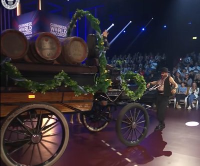 The professional circus performer, known as The Baron, had his partner sit in a carriage to bring it up to weight on the set of Guinness World Records’ German TV show Die große Show der Weltrekorde in Munich.