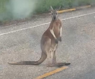 April 22 (UPI) — Employees inside a coffee truck broken down at the side of a highway captured video of the moment an escaped kangaroo hopped into traffic.