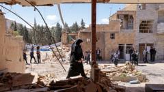 AFP via Getty Images A woman walks past the residential buildings that were damaged by recent strikes at Vahdat town in Karaj, southwest of Tehran on 3 April, with bystanders and other buildings in the background against a sunny blue sky.AFP via Getty Images