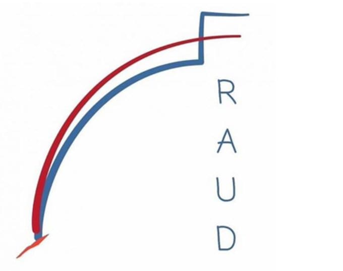 Graphic illustrating the concept of fraud with stylized letters and curved lines in red and blue colors.
